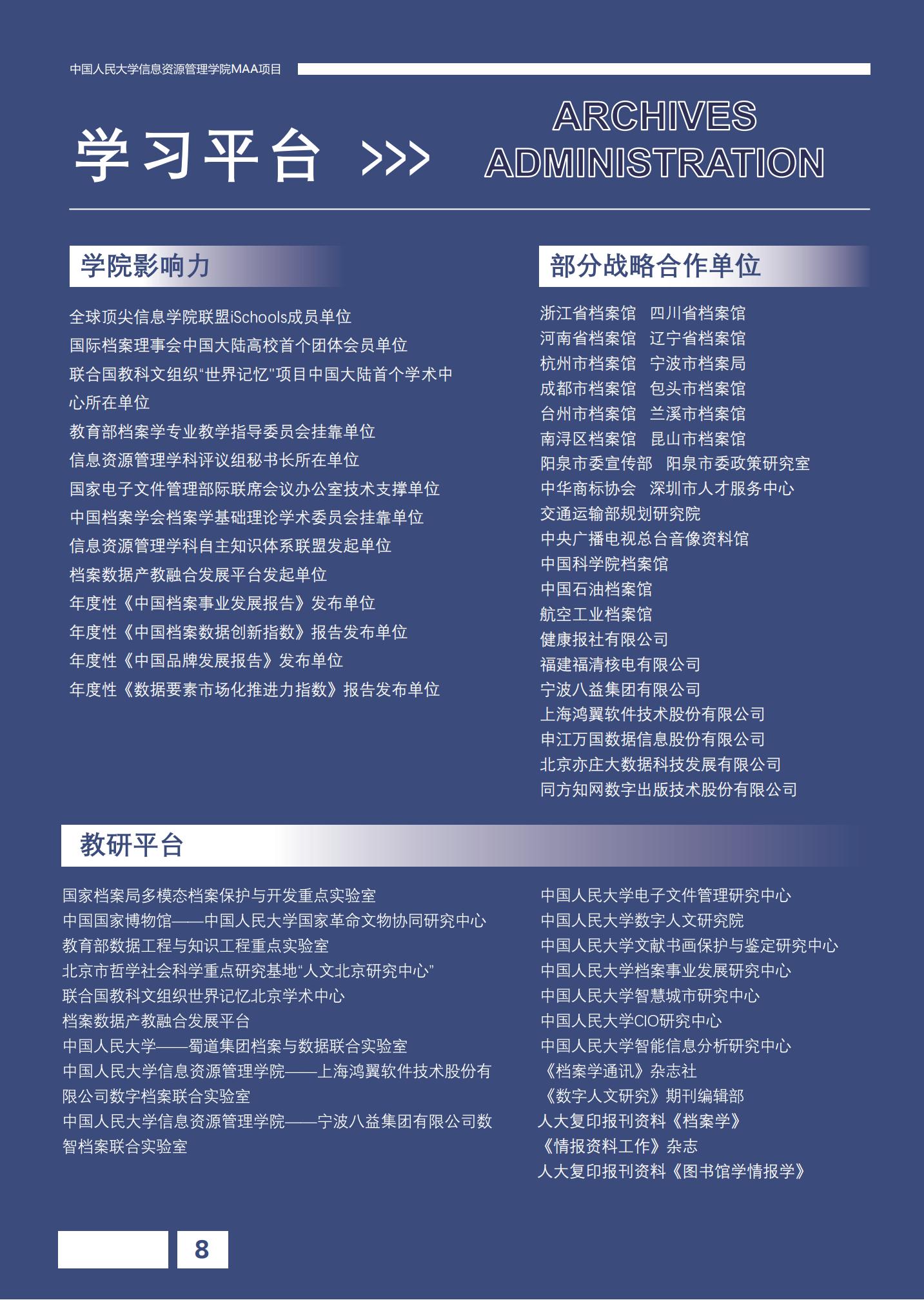 档案管理专硕(MAA)项目重点培养热爱祖国,具有良好的道德品质,理论基础扎实,实际工作能力强,胜任国家机构、政党团体和各类企业事业单位档案管理与数据管理的应用型、复合型、技能型人才。