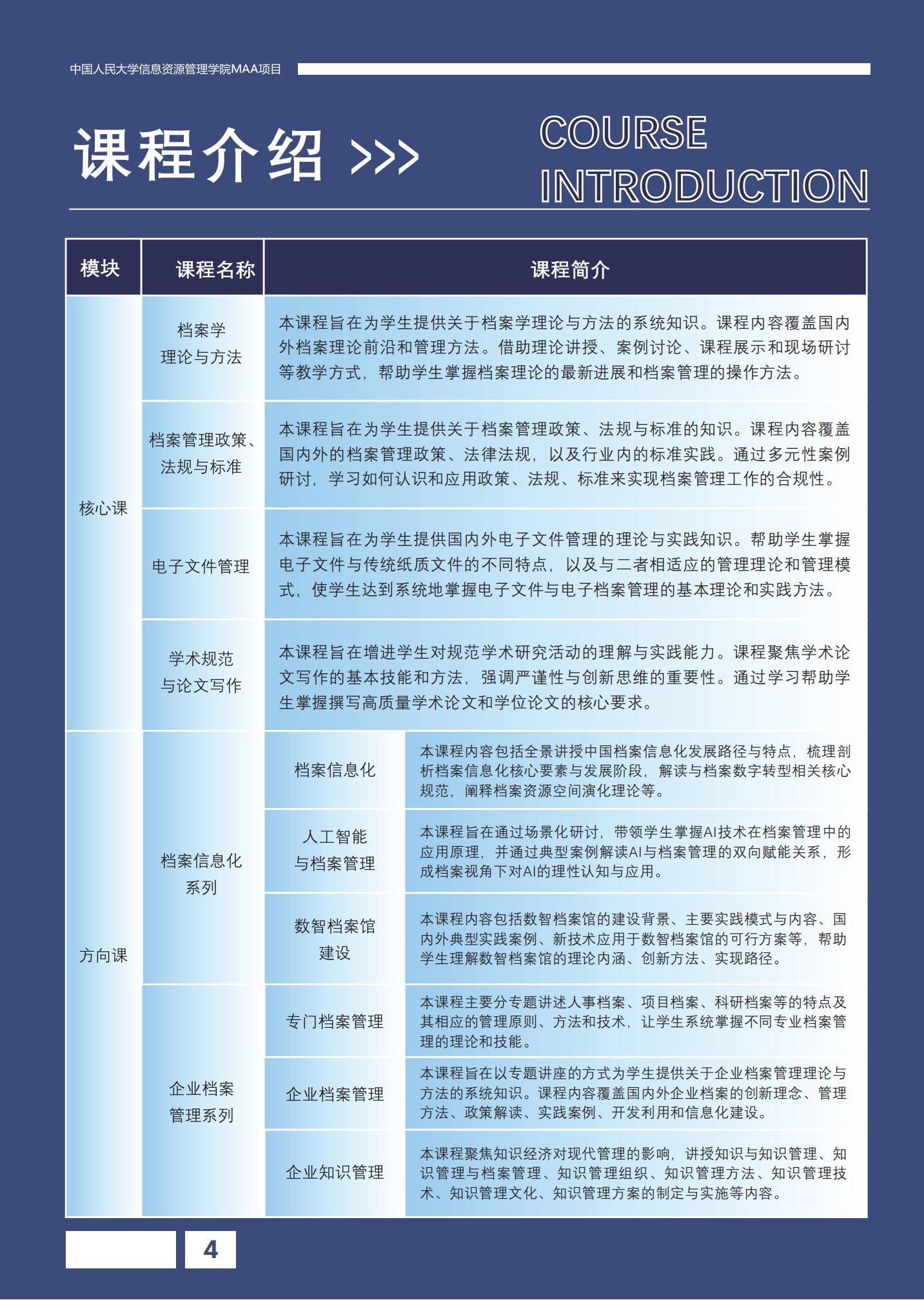 实用数据分析方法与案例、数据管理基础、数字资源组织、数据挖掘、数据可视化、档案基础与前沿、电子文件管理前沿、现代文件档案管理原理与方法、电子文件管理原理与方法、数字档案馆建设、档案信息化前沿、现代企业文件档案管理、企业知识管理、企业数字档案馆(室)理论与技术、档案知识组织与知识服务、档案数据化编研、历史档案数据化开发、文献保护理论与实践、数字资源长期保存、数据治理与档案管理、信息系统设计、数字人文前沿、数字记忆前沿等。