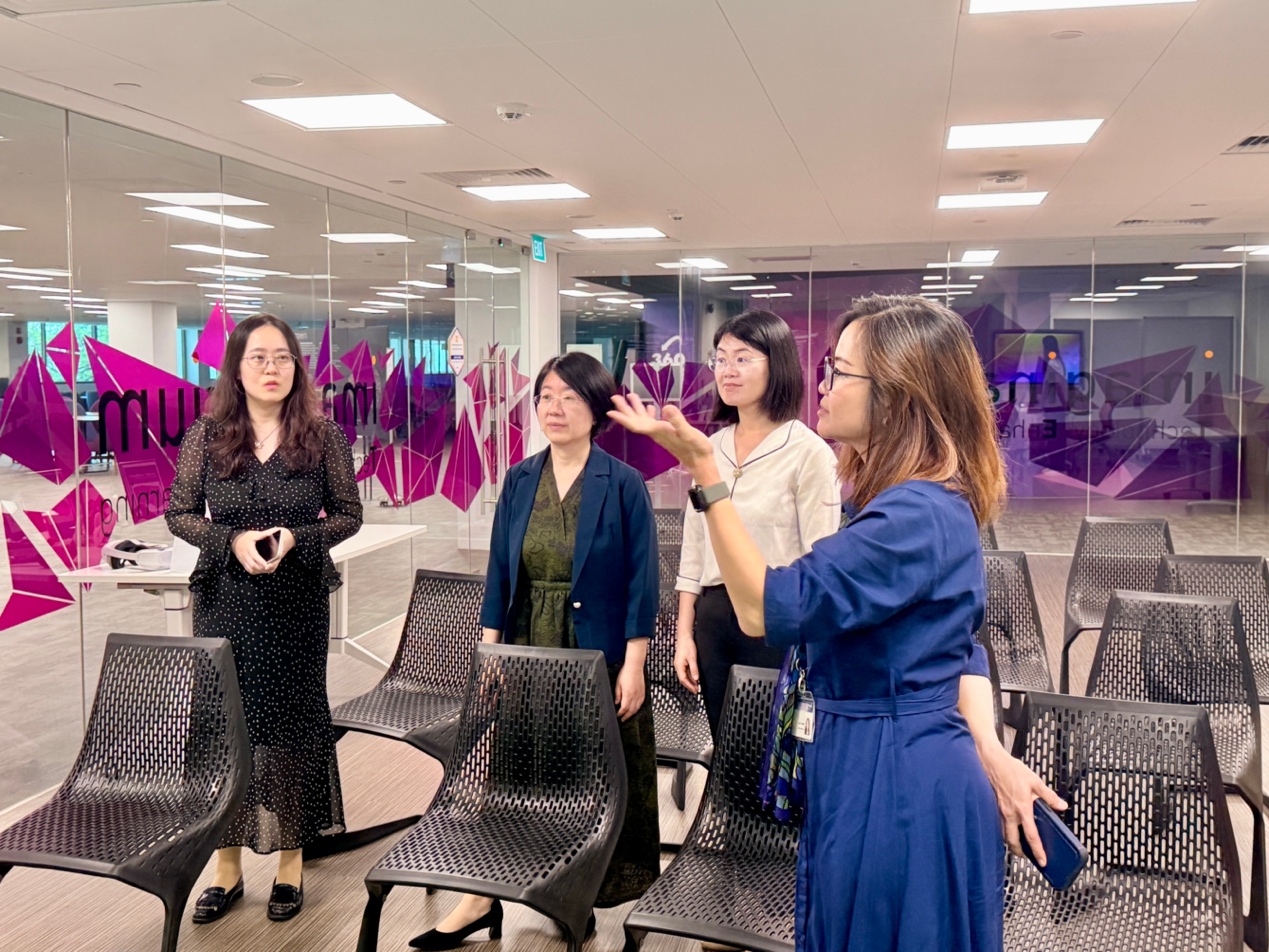 会谈前,刘越男院长一行在图书馆馆长Natalie Pang教授陪同下,参观了新加坡国立大学图书馆,了解数字人文硕士课程、3D打印、数字展览等建设情况,体验王沙数字展览以及360度影厅在数字人文项目展览中的应用。